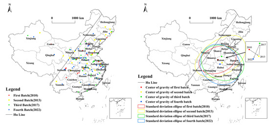 ArcGIS10.8 software was used to draw the SDE, taking the number of National Archaeological Site Parks in each province (city, district) in China per batch as the weight. The aim was to display the major regional changes in the spatial distribution of National Archaeological Site Parks and calculate the elliptic range and the center of gravity coordinates of their spatial distribution. The spatial–temporal evolution characteristics were obtained through analyses of these results.