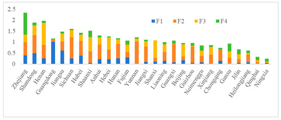where Fij represents the ith common factor score of the jth sample, Pik is the component score coefficient of the ith common factor on the kth indicator, and Qkj is the kth indicator score of the jth sample after standardization. The equation calculating the score of the three common factors is expressed as follows: