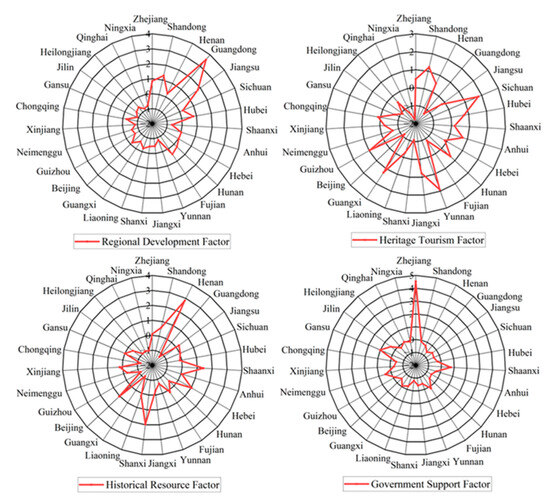 As shown in Figure 9, the Zhejiang, Shandong, and Henan provinces have higher scores in the regional development, heritage tourism, historical resources, and government support factors. These regions are particularly prominent in terms of their policy support factors and for their advantageous combination of heritage tourism and historical resource factors. Overall, the spatial differences between National Archaeological Site Parks in various regions of China are mainly reflected in the heritage tourism and historical resources factors, and regional economic development and policy support in a region are guarantors for the construction and development of National Archaeological Site Parks.