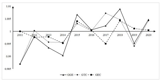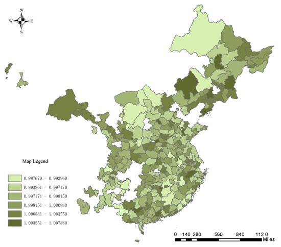 The study employed data from 2010 to 2020 to calculate the of 271 Chinese prefecture-level cities between 2011 and 2020 using Matlab. The was broken down into and . Figure 2 displays the temporal evolution of the mean value of the three indicators across all cities in the study. Figure 2 features a vertical axis with an origin at one. An index number above one signifies increased green growth in the current year compared to the previous year, together with enhanced efficiency in green growth. If the score is less than one, it suggests a decrease in the effectiveness of green growth. Between 2011 and 2014, China’s and its decomposition indicators remained below one, indicating a decrease in efficiency. Since 2015, China’s and decomposition indices have been steadily growing, showing an overall positive trend. In 2019, there was a significant decrease in the indicators, possibly due to the adverse impact of COVID-19 on the growth of the local green economy. In 2020, the indicators displayed signs of recovery. The index rose from 0.987 in 2011 to 1.005 in 2020, showing a total gain of about 0.018. The , which assesses technical change, was below one from 2011 to 2020 and over one in the remaining six years, leading to a total gain of around 0.017 in its value. Figure 2 demonstrates that the patterns of and are comparable, suggesting that China’s green economic advancement relies primarily on technological advancements. denotes variations in technical efficiency, being below one in four years and above one in six years from 2011 to 2020. However, its expansion was sluggish, indicating that China’s overall green economic effectiveness depends less on technology efficiency, which still needs enhancement.