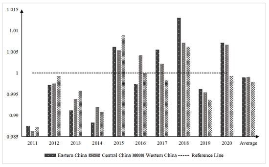 China is a vast country with numerous prefecture-level cities. All sample cities are categorized into three parts, Eastern, Central, and Western China, to more accurately represent regional variations. Figure 3 displays the temporal evolution of the index for each region and the average level from 2011 to 2020. Figure 3 shows that the growth trend is similar throughout the eastern, central, and western areas. The value was below one between 2011 and 2014 and mostly over one after 2015, aligning with the national average. The efficiency values in the eastern and central regions experienced the most rapid growth and were nearly equal when comparing their average levels. The efficiency values in the western region consistently fell behind those in the eastern and central regions, showing little growth in only a few years. The data indicate that the efficiency of green economic development is relatively balanced across the three regions of China, with the western region, which lags behind in economic development, being slightly less efficient. Hence, when analyzing the effect of fiscal decentralization on in this study, it is important to consider regional characteristics for heterogeneity analysis.