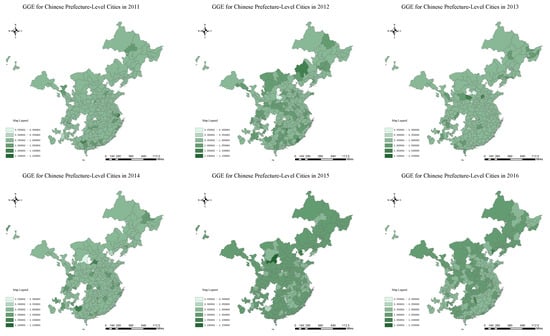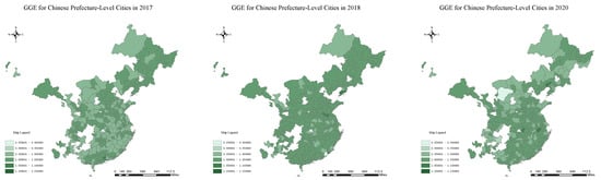 This study analyzes data from the prefecture-level city to focus on a micro perspective rather than presenting data at the national or regional level. In order to visualize the changes in and the spatial distribution characteristics of each city, this paper presents the of the Chinese sample cities in each year in Figure 4. The indexes for 2019 are not presented here, as they are not representative due to the impact of external shocks such as COVID-19. In addition, Hong Kong, Macao, Taiwan, certain cities in Tibet, Xinjiang, and other provinces are not included in the graph due to a lack of relevant data. They are represented as non-study areas and colored white. Figure 4 shows that the darker green shade corresponds to a larger value, whereas the lighter shade implies a lower value. Figure 4 illustrates that the level of greenery in Chinese metropolitan areas has progressively intensified over time, suggesting a rise in green growth efficiency. The intensification of the green color originated in central cities and has already spread to northeastern cities, as well as coastal urban areas in the east and south. The 2018 and 2020 graphs indicate a more equitable distribution of among central and eastern cities, reflecting China’s more balanced green economic growth. The eastern and central regions, comprising the provinces of Heilongjiang, Liaoning, Fujian, Zhejiang, Guangdong, Hubei, and Hunan, have higher efficiency levels as seen by the darkest hues in Figure 4. On the contrary, the majority of the western regions are less efficient, with the exception of a few cities, such as the province of Qinghai. There is an uneven distribution of among cities in the western region.