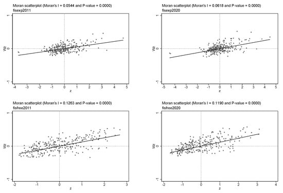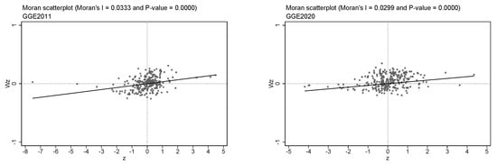 Figure 6 displays the scatter plots of local Moran’s I for , , and in 2011 and 2020, using matrix . In both years, the majority of prefecture-level cities show local Moran’s I values spread in quadrants one and three. The green growth efficiency and fiscal decentralization of cities are characterized by either high–high or low–low aggregation. The results of local spatial correlation can indicate the suitability of using a spatial econometric model.