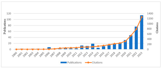 There has been a noticeable systematic increase in publications on the analyzed topics. In individual years, the number of publications fluctuated to some extent, but a dynamic increase was recorded in the years 2015–2023 (an increase from 5 to 114 publications per year). A similar tendency occurred in the number of citations; in fact, there was a systematic increase throughout the analyzed period. In 2015, the number of citations (per year) was 101. In the following years, there was a dynamic increase to 1263 in 2023 (Figure 1).