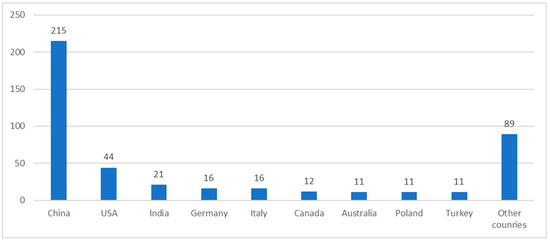 It is interesting that, despite the green transformation (including transport) being perceived as European region-led, the largest share in the number of publications on the indicated topics were from China (215), the USA (44), India (21), Germany (16), Italy (16), Canada (12), Australia (11), Poland (11), and Turkey (11) (Figure 2).