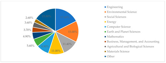 It should be noted that aspects relating to the green transformation of transport are interdisciplinary. Considering the subject area of the analyzed publications, we can distinguish, in particular, engineering (17.6%), environmental science (15.0%), social sciences (11.4%), and energy (11.0%) (Figure 3).
