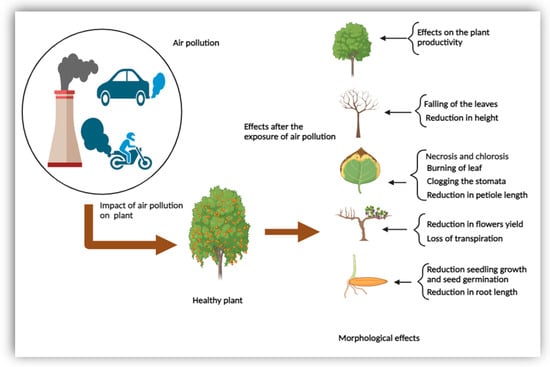 Gaseous pollutants and PM absorbed by the plant leaf may clog the stomata. Air pollution also disturbs the seed germination rate, stomata, and pedicle length and affects plant growth [34]. Automobile pollution absorbed by the leaf surface causes necrosis and chlorosis in morphological regions and decreases the anatomical layer thickening by surviving under traffic stress [35]. Roadside plants exposed to air pollutants from vehicles can show reduced leaf area, stomatal function, and leaf numbers and increased epidermal cell numbers, branch length, and trichome length in plants [36]. Plant morphological damage is shown in the form of different diseases containing chlorosis, necrosis, and leaf burning in the plants at highly polluted stress areas. Significant reductions were demonstrated in leaf length, leaf width, leaf area, petiole length, and leaf attributes at polluted sites [37]. Many other effects, like reduction in leaf size, thinness in the cuticle of the leaf, and decreased stomatal density of Platanus orientalis due to air pollution, have been observed [38]. Plants’ exposure to ozone causes leaf injury and white spots on the leaves, converting into brown necrosis spots. There are many symptoms shown by ozone absorption, including wilting, bleaching, and bronzing patterns in interveinal patches and the development of exceptional patterns on leaves [39]. Gaseous pollutants and PM affect the morphology of plants. Both leaf length and breadth were reduced under air pollution compared to non-polluted areas [38]. Morphological traits like leaf length, leaf area, stem length, branch number, stomatal damage, leaf injury, and leaf width were decreased in Malva parviflora at polluted sites compared to healthy environments. A reduction in leaf area was observed in plants located in unclean areas [40]. Shafiq et al. [41] examined the status of air pollutants on the productivity of trees. Some internal injuries and changes in physiological processes might alter plants at anatomical and morphological levels. Dry weight of leaves of Alstonia scholaris, Paullinia pinnate, Senna saimea, and Peltophorum ptrocaprum was reduced in a polluted environment. There are many morphological changes due to air pollution, as shown in Figure 2.