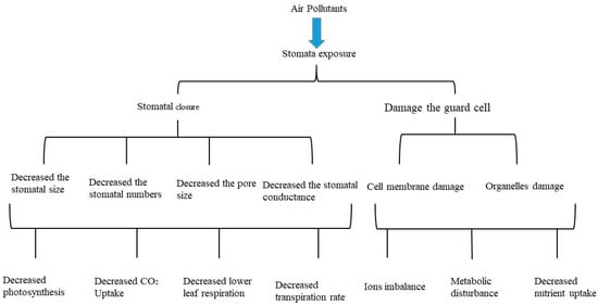 Stomata are an essential factor in maintaining plants’ development and growth process. Stomata comprise two guard cells that maintain stomatal function [42]. Stomatal density and width of stomata decrease due to high concentrations of CO and SO2. Wagoner et al. [43] investigated the leaf cuticle and leaf variation in Plantago lanceolata at polluted and nonpolluted sites. Stomatal frequency is higher on the leaf’s upper surface at contaminated sites than at nonpolluted sites. Modifying the size and frequency of stomata is essential for absorbing pollutants in a pollution-stress condition. Decreased stomatal size was observed in Lotus corniculatus, Trifolium montanum, Trifolium pratense, and Trifolium repens at the contaminated sites. Changes in the inner wall of the stomata have been observed due to air pollution [44]. Different concentrations of heavy metals released by vehicles and industries drastically affect plants. These heavy metals reduced the stomatal conductance, pore size, stomatal density, and stomatal closure of plants including Bacopa monniera, Nicotiana tabacum, Arachis hypogaea, and Eichhornia crassipes [45]. There are many process effects on stomata structure due to air pollutants, as shown in Figure 3.