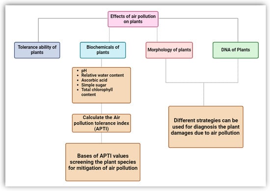 This study showed that air pollution can cause morphological, physiological, biochemical, and genetic effects in plants. The tolerance ability of different plant species depends upon their biochemical processes. Air pollution absorbed by plants through leaves and soil predominantly affects these biochemical processes, and is reflected in plant morphology. Many biochemical, morphological, and genetic effects in plants have been noted in this review. Some plants can endure stress-polluted conditions. This review provides APTI values for plant species in air-polluted environments. The different plant species that have tolerance based on their APTI values are used to develop green belts in urban areas and mitigate air pollution. This study also contributes to our knowledge of the effects of pollution on plants and curing plant species using different strategies in the future (Figure 5).