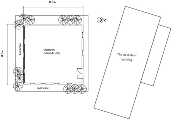 For the BES model adopted in this study, the process of simulation utilised a single-storey building at The University of Newcastle, Australia, as the reference building and base case model. The building is classified as a generic representation of a building in climate zone 5, according to the Australian Building Codes Board. It is located in a warm climate and possesses architectural characteristics commonly encountered in educational buildings. The building materials and construction methods used for walls, floors, and windows are typical for this type of building. The architectural structure has a square configuration, measuring 10.5 m in length, 10.5 m in width, and 3.5 m in height. Its overall volume is estimated to be around 386 m3, as seen in Figure 2 and Figure 3. DesignBuilder (DB) was used to simulate scenarios characterised by different ABDPs. Comprehensive energy simulation was utilized to assess the performance of educational spaces under various ABDPs in both hot summer and cold winter environments. This was completed to attain an optimal balance between thermal comfort and energy consumption. The environmental factors for the zone were carefully chosen to establish a realistic energy simulation, allowing for adjustable indoor environmental conditions that could be altered throughout the year-long simulation process. The weather data for all computations were obtained from an EnergyPlus weather (EPW) file that specifically captured the climatic characteristics of Newcastle [66,67]. The fundamental geographic and climatic conditions in Newcastle, Australia, can be summarized as follows: