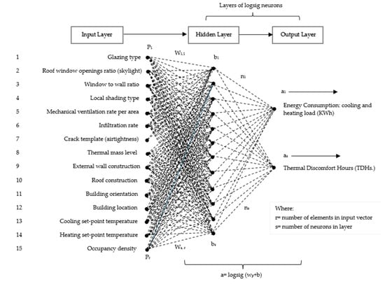 Hence, building energy simulation (BES) was applied to generate broad scenarios of ABDPs and the associated EC and TDHs quantities (1846 scenarios). These scenarios were set up in the neural network toolbox, in order to develop an ANN model to predict EC and TC for any given combination of ABDPs. The proposed ANN model for this study is depicted in Figure 4. The specifics of the ANN are as follows: