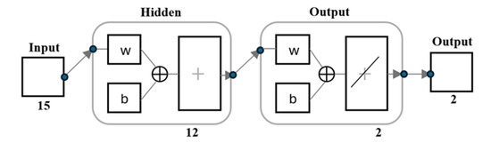 Block diagram for proposed ANN with 15 inputs, 2 outputs, and 12 hidden layers.