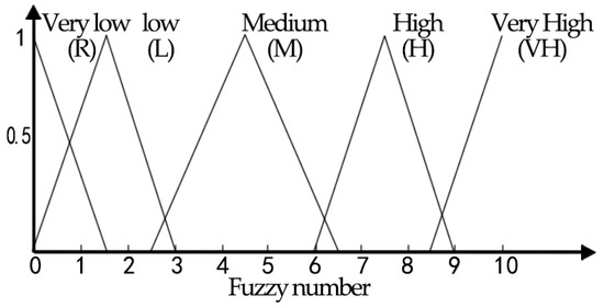 Human thinking and speech can be imprecise, leading to the usage of fuzzy language in evaluating service success. This includes phrases like “should”, “seemingly”, and “very prominent.” Thus, in this work, the variables indicator severity (S), occurrence (O), and detection (D) are utilized as fuzzy linguistic variables to form a set of fuzzy linguistic terms. The evaluation of each variable involved the use of five evaluation phrases, and the score for each evaluation indicator was measured on a scale ranging from 0 to 10 [23]. In previous studies, fuzzy linguistic word sets were statistically characterized using triangular fuzzy numbers [24]. Suppose there are experts and the weight of the th expert is . The evaluation of the risk of item failure by this expert () is represented by a triangular fuzzy number , where represents the lower term value, represents the mid bound, and represents the upper bound, as shown in Equation (1).