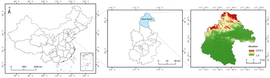 Jizhou District, situated in the northernmost part of Tianjin City, China (Figure 1), has a total area of 1590.22 km2. In 2022, approximately 795,500 people inhabited the district, and the regional GDP reached 250.40 billion yuan, with the three industries contributing to a ratio of 19.2:21.8:59. Geographically, Jizhou District lies at the convergence of the Yanshan Mountains and North China Plain. The terrain gradually ascends from north to south, resulting in a difference in altitude of 1076.70 m and forming a tiered distribution pattern. Additionally, the district boasts rich historical and cultural heritage, featuring 23 scenic spots within its territory. Notable attractions include one 5A-level scenic spot, the Panshan Scenic Area, and five 4A-level scenic spots, such as the Huangyaguan Great Wall, a World Cultural Heritage site, the ancient Dule Temple, Limutai Scenic Area, Jizhou Karst Cave, and Guojiagou Scenic Area. Moreover, there are seven 3A-level scenic spots. Recognized as one of Tianjin’s significant ecological functional zones and a core area for the coordinated development of Beijing, Tianjin, and Hebei, Jizhou District boasts abundant natural resources, including forest, mineral, and water resources. Furthermore, the areas surrounding the district have poor resources, and the ecological resources are highly damaged. Only Jizhou District has a superior ecological environment and rich biodiversity, which has the potential to repair and maintain the balance of the ecosystem of the Beijing–Tianjin–Hebei urban agglomeration. Additionally, research on the development and utilization of ecological products in the district can also present Chinese solutions based on Chinese wisdom to protect and develop other similar super-large urban agglomeration ecosystems globally.
