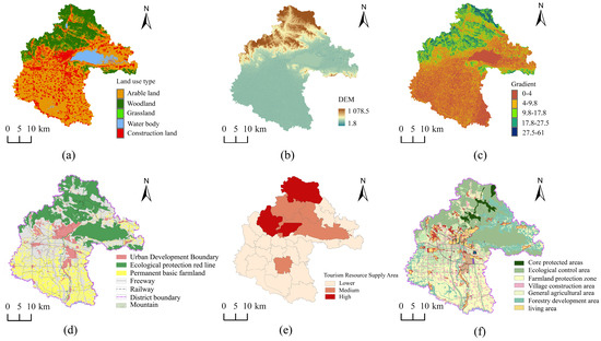 (a) Land use types in Jizhou District, (b) Elevation of Jizhou District, (c) Slope of Jizhou District, (d) Territorial spatial control line planning map of Jizhou District, (e) Tourism resource supply area of Jizhou District, (f) Territorial spatial functional zoning planning map of Jizhou District.