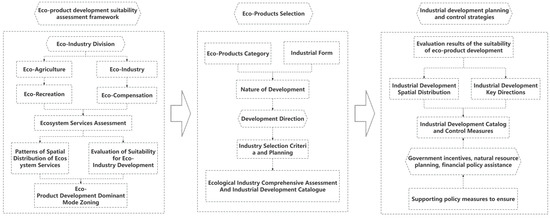 The general framework for evaluating the suitability of ecological product development can be formulated according to the following scheme: ecological products are divided into high-quality ecological products (developed to a certain extent and possessing development value) and potential ecological products (not yet developed). Considering the natural background and ecosystem conditions in the region, the quality and supply of ecological products are evaluated to determine the range of existing high-quality ecological products and potential ecological products to complete the screening process of ecological products. Subsequently, according to the characteristics of different eco-products, the main ways and methods of their development are clarified, and the interactions between high-quality eco-products, potential eco-products, eco-industries, and environmentally sensitive industries are constructed. Next, a variety of relevant development factors are introduced, and a complete set of evaluation index systems, measurement methods, and assessment rules are established. Then, the suitability of developing eco-products is assessed, and the specific development direction is clarified. This provides a basis for rational regional planning and evaluation of implementation paths, aiming to maximize the value of ecological products and optimize the layout of related industries.