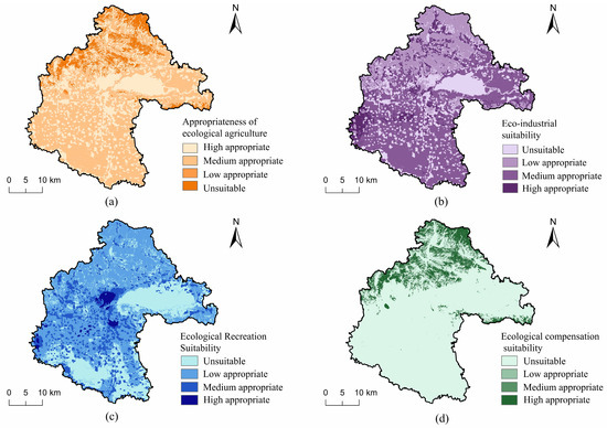 where represents the suitability evaluation score of ecological agriculture; represents the suitability evaluation score of ecological industry; represents the suitability evaluation score of ecological health care; and represents the suitability evaluation score of ecological compensation [9].