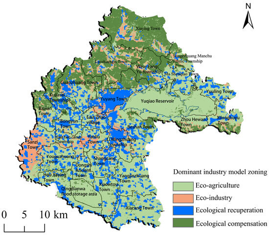 Based on the zoning of each industrial model, among the four leading models, the ecological agriculture-led industrial model encompasses the largest and most widespread implementation locations, covering approximately 45% of the total area of Jizhou District. Conversely, the eco-industry-led industrial model has relatively fewer locations. The proportions of ecological health care and ecological compensation regions are approximately equal, each accounting for about 15% of the total area (Figure 6).
