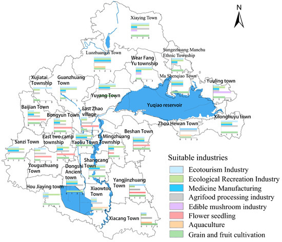 To create a comprehensive development map (as shown in Figure 7) for ecological products, we need to integrate the evaluation results of various ecological product categories and their spatial distribution. This involves overlaying the suitability evaluation scores for ecological agriculture, ecological industry, ecological health, and ecological compensation. The mountainous areas (townships) in the northern part of the Jizhou District exhibit better ecological environments and stronger ecological product supply capacity. They are highly suitable for developing ecotourism and environmentally sensitive industries. Towns such as Xiaying Town, Luozhuangzi Town, Chuanfangyu Town, Guanzhuang Town, and Xujiatai Town are particularly suitable owing to their good air and water environment quality and vegetation coverage. Zhouhewan Town, Yuyang Town, and Xilonghuyu Town also have good air and water environment quality, with Yuyang Town having well-developed transportation facilities. They are highly suitable for industrial development, focusing on ecological health care, eco-tourism, pharmaceutical manufacturing, agricultural and sideline food processing, and aquaculture. Despite the relatively poor air quality, Ma Shenqiao Town, Chutouling Town, Dongzhao Gezhuang Town, and Yangjinzhuang Town are highly suitable for development in three industrial directions: eco-tourism, grain and fruit planting, ecological health care, and other industries. Sangzi Town and Dongshi Ancient Town have good industrial foundations and pharmaceutical and medical manufacturing foundations and are highly suitable for pharmaceutical manufacturing, as well as agricultural and sideline food processing. Bangjun Town, Baijian Town, Dongerying Town, Limingzhuang Town, Youguzhuang Town, Xiacang Town, and Xiawotou Town have at least one highly suitable development industry direction. Despite lacking highly suitable development industry directions, Sungezhuang Manchu Township has three suitable development industry directions, two sub-suitable development industry directions, and three unsuitable development industry directions.