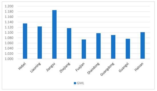 Using the GML index method and MATLAB software, we calculated the level of green total factor productivity. Figure 2 shows the GML index of the marine aquaculture industry in different Chinese regions. When considering changes in green total factor productivity (TFP), the nine provinces that were sampled for the study had an average GML index that was greater than 1, which suggests that, from 2012 to 2021, the green TFP in the marine aquaculture sector in these provinces continued to improve. Among the provinces, the top five in terms of average GML index were Jiangsu (1.185), Hebei (1.135), Liaoning (1.123), Zhejiang (1.117), and Hainan (1.101), with annual growth rates of 18.5%, 13.5%, 12.3%, 11.7%, and 10.1%, respectively, ranking high in growth rates and exhibiting rapid improvements. Given the constraints of resource and environment, coastal regions have shown an increased attention to green total factor productivity, consistently looking for ways to advance the marine aquaculture sector’s green development. The regional heterogeneity along the coastal areas may be attributed to the diverse climate and ecological conditions, as China’s maritime territory extends from the Bohai Sea in the north to the South China Sea in the south, spanning 44 degrees of latitude. Consequently, different regions face varying conditions and constraints at different stages of industrial development in the marine aquaculture sector.