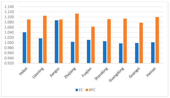 From 2012 to 2021, the BPC and EC indices of various provinces in China are presented in Figure 3. Looking at the BPC index, the average BPC index of the nine coastal provinces was consistently above 1, indicating progress in the marine aquaculture technology of these regions. Among them, Zhejiang showed the fastest technological progress, with an annual growth rate of 11.3%. Additionally, Liaoning and Hainan also demonstrated notable progress in technology, with annual growth rates of 10.5% and 10%, respectively. However, Fujian exhibited relatively slower growth with an annual average of 3.7%, underscoring the need to enhance the technological level in the aquaculture process and elevate the green aquaculture technology in the marine aquaculture industry. Regarding the EC index, seven provinces had an annual average EC index exceeding 1, indicating a gradual convergence of production efficiency towards the production frontier. The provinces were ranked in descending order of annual average EC index as Jiangsu, Hebei, Liaoning, Fujian, Shandong, Zhejiang, and Hainan; Guangdong and Guangxi had average EC indices below 1, indicating a decline in green production efficiency in the marine aquaculture industry due to an irrational allocation of resource elements. When considering the combined effects of the EC and BPC indices, provinces with both indices exceeding 1 demonstrated continuous progress in the production process while maintaining a rational proportion of input factors. This combined effect has facilitated the improvement in green total factor productivity. For Guangdong and Guangxi, where the BPC index exceeded 1 but the EC index was below 1, it suggests that, while technological progress is occurring in the production process, the ineffective allocation of resources led to a decrease in green total factor productivity in the marine aquaculture industry, despite advancements in production technology.