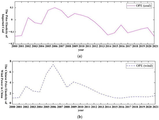 Selfprice elasticity of imported coal, Chinese wind power generation, and Chinese photovoltaic power generation in China from 2000 to 2021. (a) The price elasticity of imported coal. (b) The Chinese price elasticity of wind power in China. (c) The Chinese price elasticity of photovoltaic electricity generation.