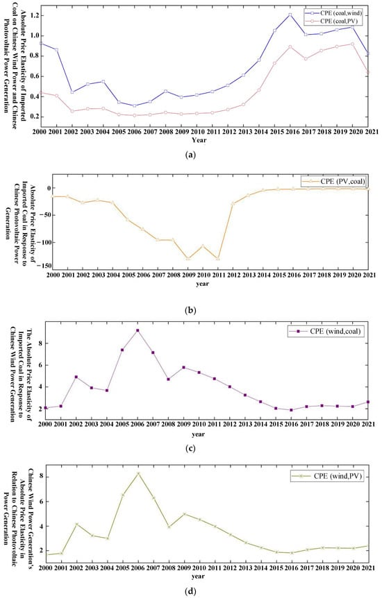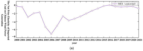The net price elasticity trends of imported coal, Chinese wind power generation, and Chinese photovoltaic power generation in China from 2000 to 2021 (including the base year) are illustrated in Figure 4. A comparative analysis between Figure 3b,c and Figure 4c,d reveals that the changes in net price elasticity of Chinese wind power generation and Chinese photovoltaic power generation induced by fluctuations in imported coal prices are similar to the effects of absolute price elasticity changes. This suggests that, in the face of external shocks caused by fluctuations in imported coal prices, the net and absolute substitution effects of Chinese wind power generation with respect to imported coal tend to align, as do the net and absolute complementary effects of Chinese photovoltaic power generation. The long-term analysis from Table 11 indicates that Chinese wind power generation exhibits a relatively significant substitution effect towards imported coal, whereas the complementary effect of Chinese photovoltaic power generation with respect to imported coal is more pronounced. However, as indicated by Figure 4d, the relationship between Chinese photovoltaic power generation and imported coal is shifting towards substitutability, suggesting that Chinese-produced photovoltaic power is increasingly likely to become a strong substitute for imported coal.