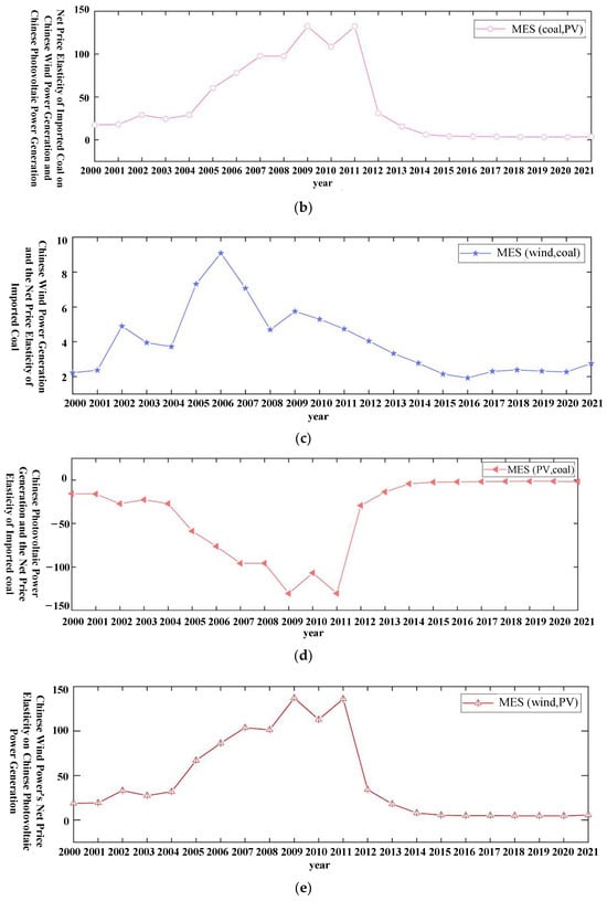 Absolute price elasticity of imported coal, Chinese wind power generation, and Chinese photovoltaic power generation in China from 2000 to 2021. (a) Absolute price elasticity of imported coal on Chinese wind power and Chinese photovoltaic power generation. (b) Absolute price elasticity of imported coal in response to Chinese photovoltaic power generation. (c) Absolute price elasticity of imported coal in response to Chinese wind power generation. (d) Chinese wind power generation’s absolute price elasticity in relation to Chinese photovoltaic power generation. (e) Absolute price elasticity of Chinese photovoltaic power generation in relation to Chinese wind power generation.