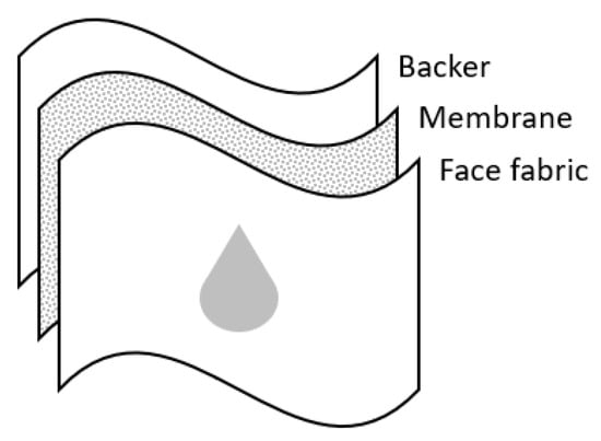 One textile outdoor product that is frequently sold in physical second-hand stores and on digital second-hand platforms in Sweden is the shell jacket. Shell jackets are windproof, water repellent, water penetration resistant, and breathable jackets comprising a technical textile called membrane laminate. The laminates consist of a face fabric, a membrane, and a backer for a 3-layer laminate (see Figure 1), and a face fabric and a membrane for 2- and 2.5-layer laminates. The technologies and materials used to produce the membrane laminates vary between manufacturers, but common to all shell jackets is the water repellent finish, called durable water repellent (DWR), which is applied to the face fabric. Manufacturers encourage users to wash and reapply DWR to their shell jackets regularly to optimize the performance of the membrane laminate and prolong the life of the jackets. DWR can either be sprayed onto the jacket after washing or be washed in during a second wash cycle [21,22].