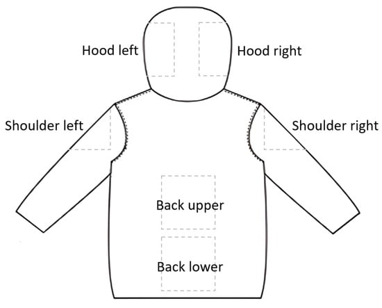 The second-hand performance of the jackets was identified using material testing. Six test samples of 200 × 200 mm were cut from each jacket. Two test samples were cut from the hood (left and right), two from the shoulder (left and right), and two from the back (upper and lower), as shown in Figure 2. Air permeability and water repellency were tested for all six test samples. Water penetration resistance and breathability were tested for two test samples each, with water penetration resistance examined on the left shoulder and lower back and breathability investigated on the right shoulder and upper back. Water penetration resistance and breathability were not tested on the test samples taken from the hood due to the presence of seams on some of the hood test samples, which affected the test results.