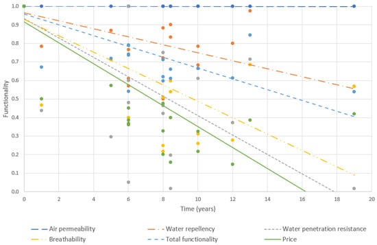 Figure 3 presents the change in functionality as a function of time (0–19 years) for each of the functionalities investigated. Air permeability remains stable over time, whereas water repellency decreases at a rate of around 2% per year. In contrast, breathability and water penetration resistance decrease more rapidly over time (about 5% per year). In total, functionality, if measured as the total aggregated value of the four measured functionalities, decreases at a rate of about 3% per year.