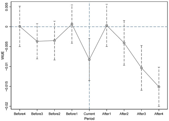 where n is the distance between the policy release time and 2014. To study the dynamic effects in the year of policy release and the 4 years before and after the policy release, n is used as an independent variable, and the rest of the variables are consistent with the meaning of Equation (1). According to the analysis in Figure 2, the regression coefficient fluctuates around the 0-axis in the first 4 years of the policy, indicating that there is no significant difference between the WUE of the two groups; the regression coefficients decreased significantly in 2014, indicating that the WUE in the pilot provinces improved significantly after policy implementation compared to that in the nonpilot provinces. However, the effect disappears after 1 year of policy implementation, which indicates that the effect is not stable enough and is recurrent. After 3 years of policy implementation, the effect becomes significant again and continues to improve in the fourth year, which indicates that there is a time lag in the improvement of WUE. At the overall level, there was a parallel trend between the two groups before 2014, and after the implementation of the policy, the pilot provinces significantly improved their WUE, which satisfied the parallel trend hypothesis.