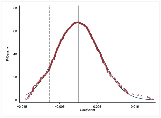Drawing on the approach of Chetty et al. (2009) [33], we exclude the interference of omitted variables by randomly selecting pilot provinces for a placebo test of the model [34]. Specifically, this paper constructs dummy variables for “pseudo-WRT” by randomly generating a list of pilot provinces among all provinces. This process is repeated 500 times to obtain 500 values of based on Equation (1); then, the kernel density distribution of is plotted, as shown in Figure 3. The estimated coefficients generated based on random samples are distributed approximately 0 and follow a normal distribution. The estimated coefficients obtained from the benchmark regression results of this article are far from 0, proving that the placebo test is passed.