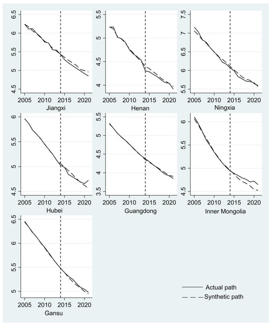 Drawing on Ji et al. (2021) [39], the SCM is used to study the policy effects in different provinces. To maintain consistency with the previous paper, this paper takes 2005–2021 as the policy study interval, chooses all the control variables as predictor variables, takes 23 nonpilot provinces as the control group, and synthesizes the water consumption per unit of GDP of seven pilot provinces according to different weights. Trends in the logarithm of water consumption per unit of GDP in the pilot and synthetic pilot provinces are shown in Figure 4, with the dashed line representing the year 2014, when WRT was initiated.