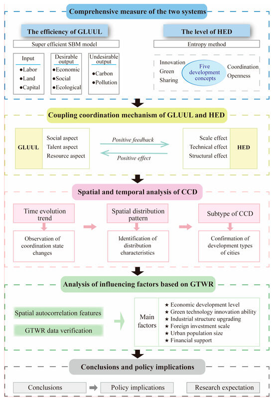 The literature review indicates that research results on urban land use and HED are very rich, but there is still some room for expansion. In terms of land use, few researchers integrate both “environmentally friendly” and “low carbon” into urban land use systems, while GLUUL is an inevitable requirement for sustainable development. From a research perspective, few scholars pay attention to the coupling coordination of land and economic systems during urbanization, while investigating the relationship between GLUUL and HED has a realistic value in promoting the coordinated development of a “resource-economy-environment”. In the aspect of measurement methods, previous studies mostly used econometric models to analyze influencing factors, which failed to deeply explore their spatial–temporal dynamic changes [33,34]. Considering this, this article aims to provide a holistic perspective on GLUUL and HED and their coordination relationship and proposed a systematic and coherent framework for in-depth analysis (Figure 1). Taking 282 cities in China as research objects, this paper uses data from 2005 to 2020 to gradually study the spatial–temporal evolution characteristics of GLUUL efficiency and HED level and their coordination relationship and uses the GTWR model to reveal the dynamic evolution of the main factors affecting CCD, and then, some valuable policy references are proposed.