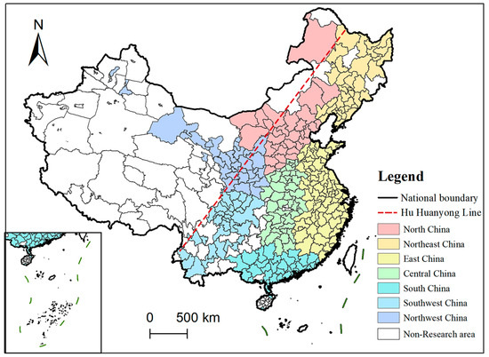 As the largest developing country in the world, China’s urbanization process is ongoing and is currently at a critical stage of transitioning from resource- and factor-driven primary urbanization to innovation- and talent-driven secondary urbanization [60]. Therefore, China must balance the relationship between urban land use and economic development while considering resource and environmental constraints. Taking it as a research object to quantitatively examine the coordination relationship between GLUUL and HED can provide a valuable reference for other developing countries or regions. Due to the unavailability and inaccuracy of data on GLUUL efficiency-related measures at the municipal level, some cities with missing data were excluded from the study area. This paper identified 282 cities throughout China as the study object, including 33 cities in North China, 33 cities in Northeast China, 77 cities in East China, 42 cities in Central China, 36 cities in South China, 31 cities in Southwest China, and 30 cities in Northwest China. Their specific distribution is shown in Figure 2.