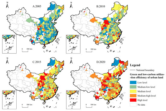 Figure 4 illustrates that in 2005, GLUUL efficiency was at a low or medium–low level in most regions, and a few cities with high or medium–high levels were mainly concentrated in Gansu Province. In 2010, the number of low-level cities decreased significantly. Most of them lay in the medium–low or medium level. The high-level and medium–high-level cities were obviously concentrated in the intersection of Gansu, Ningxia, and Inner Mongolia. In 2015, the number of medium-level cities increased drastically, lower-level cities only included Chongqing, Hulunbuir, Jiaozuo, and Dongguan. High and medium–high-level cities were concentrated along the “Hu Huanyong Line” and the southeast coast. In 2020, the number of cities with high and medium–high levels further increased, accounting for more than 60% of the total. Chongqing and Hulunbuir lay in the low level, and Tianjin dropped to the low level.