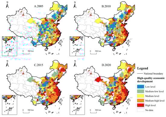 Figure 5 shows that in 2005, cities with high and medium–high HED levels were predominantly located along the eastern coast, and the central region was mainly at medium and medium–low levels, while the western region was mainly at low levels. From 2010 to 2020, the distribution of HED levels decreased from east to west, which is essentially unchanged. The number of cities with high and medium–high levels of HED has risen significantly, reaching 69% in 2020, and most of them were in the east. There were only 12 low-level cities left, located dispersedly in the western region.