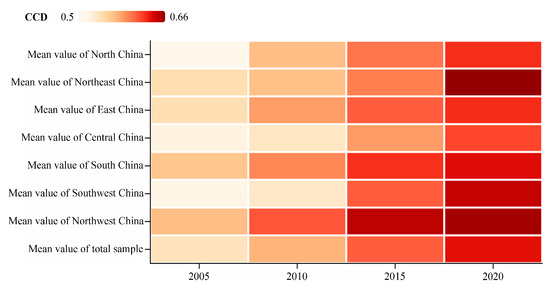 Figure 7 shows the mean value of CCD between GLUUL and HED in different regions during 2005–2020. In the aspect of the time dimension, the average value of each region and the whole country presented a steadily increasing trend, with the overall mean value rising from 0.5378 in 2005 to 0.6335 in 2020, exhibiting a growth rate of 17.8%. It indicates that GLUUL and HED were further harmonized in all regions during the investigation period. From the inter-regional comparison, in 2005, Northwest China had the highest mean value for CCD, followed by South China, and the lowest in North China. By 2020, the average value of CCD in Northeast China became the highest, followed by Northwest China, with the lowest value expected in Central China. Throughout the period of study, Southwest China was the fastest moving towards harmonization with an average growth rate of 7.7%, followed by Northeast China with an average growth rate of 6.72%, and South China with the slowest rate of 4.19%.