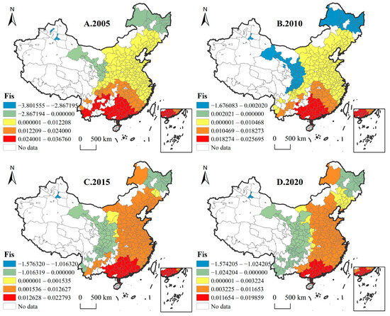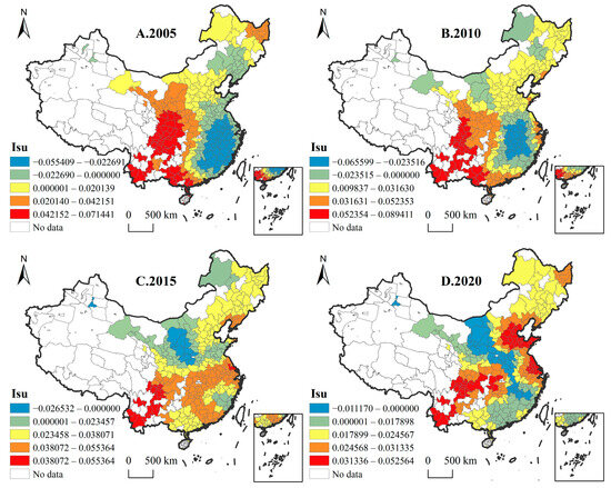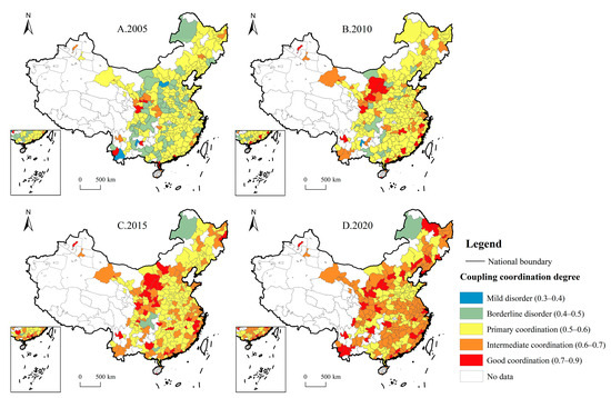 Spatial–temporal analysis of CCD. Panels (A–D) depict the changes in CCD in 2005, 2010, 2015, and 2020, respectively.