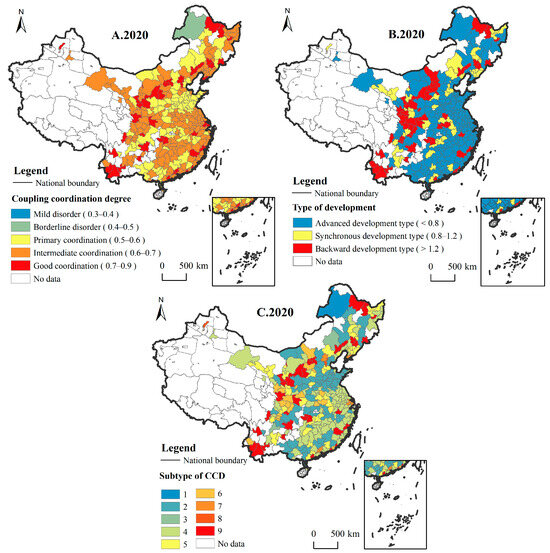 Spatial distribution of the subtypes of CCD. Panels (A–C) depict the distribution of CCD, type of development, and subtype of CCD in 2020, respectively.