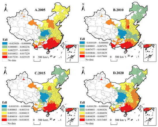 Spatial–temporal analysis of HED level. Panels (A–D) depict the changes in HED levels in 2005, 2010, 2015, and 2020, respectively.