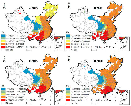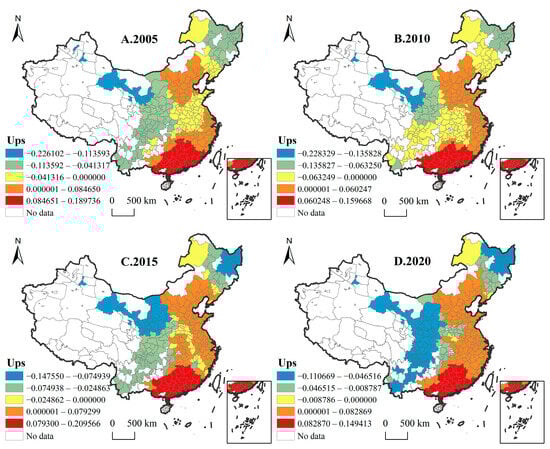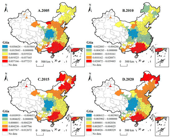 Spatial–temporal analysis of GLUUL efficiency. Panels (A–D) depict the changes in GLUUL efficiency in 2005, 2010, 2015, and 2020, respectively.