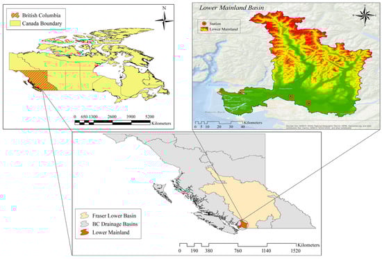 The British Columbia Drought Information Portal (DIP) reports a severe drought situation with a Drought Level 5—Adverse Impacts Almost Certain, signifying a critical water scarcity condition. This portal was established to serve as a comprehensive and centralized geographic information system for the residents of British Columbia. The DIP application employs a multifaceted approach, incorporating several embedded maps to provide users with valuable data related to drought conditions. The information available through the DIP encompasses various aspects, including the provincial drought levels, historical drought patterns over time, and supplementary drought-related details. Furthermore, it is important to note that the Drought Portal ensures that the drought levels and associated data are regularly updated promptly as new information becomes accessible through its website. In British Columbia, drought levels are typically assessed using a scale ranging from 0 to 5, with Drought Level 5 being the most severe and critical. This designation signifies that the likelihood of adverse impacts on communities and ecosystems is extremely high. As of the latest available data, which were recorded on September 21, it is observed that most of British Columbia’s water basins are currently experiencing Drought Levels 4 or 5, indicating a widespread and significant water shortage situation across the region [18]. Four meteoritical stations from Environment and Climate Change Canada (ECCC) were selected for the drought monitoring. The coordinates of this station are presented in Table 1.