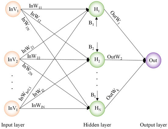 ELM is primarily characterized by its extremely fast learning speed and ease of implementation [31]. It randomly assigns input weights and biases and analytically determines the output weights of SLFFNNs. This approach eliminates the need for iterative adjustment, making the learning process significantly faster than conventional gradient-based learning methods. A schematic of the ELM structure is presented in Figure 2.