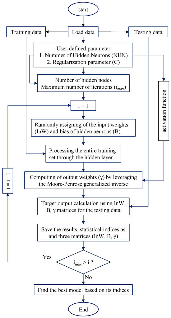 The modeling process begins with the initialization phase, where the structure of the IORELM is outlined, specifying the number of hidden nodes and randomly assigning input weights and biases to these nodes. In this study, the maximum number of iterations and number of hidden neurons were considered as the maximum value that can be taken. These values were calculated using Equation (19) [31].