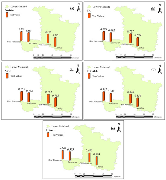 Figure 4d includes the Recall test values for four stations within the study area, the Lower Mainland Basin in British Columbia. The average Recall value for the four stations is approximately 0.361. For the analysis of the Recall values in relation to the geographic location of the stations, stations closer to the ocean (West Vancouver and Vancouver stations) have more predictable moisture patterns due to the proximity to large bodies of water, which could lead to higher Recall as the model may better identify actual drought events. However, suppose drought patterns are less common because of the marine climate. In that case, the Recall might be lower since there are fewer drought events to identify, which can affect the model’s ability to learn from such events. Furthermore, those stations away from the ocean may experience more variable weather patterns and potentially have less predictable soil moisture levels due to terrain and elevation, leading to a lower Recall if the model fails to identify all positive cases.