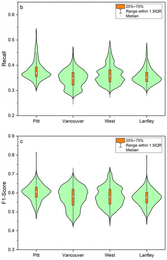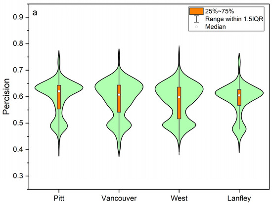 Figure 5a examines the Precision metric across four stations through a violin plot. The median Precision values, which represent the middle point of the data distribution, remain consistent across stations, hovering between 0.6 and 0.63. Pitt station boasts the highest median Precision, while West Vancouver exhibits the lowest. The distribution of data points around the median and the first quartile (Q1) follows a similar pattern across stations, indicating a clustering of values within this range. Moving from Pitt to Langley, we observe a gradual decrease in the third quartile (Q3), maximum, and minimum values, which are 1.5 times the interquartile range (IQR). This suggests a reduction in variability as we move along this path. Interestingly, Langley stands out with the maximum value of Q1 at 0.55, whereas West Vancouver records the lowest at 0.51. Despite this variation, the values of Q1 remain relatively stable overall. Comparing the differences between Q1 and Q3, we notice a consistent pattern in Pitt and Vancouver, whereas West Vancouver exhibits a significant difference of almost 0.11, indicating greater variability in this station. The maximum (Q4) and minimum (Q0) values follow a similar trend across all stations, ranging from 0.8 to 0.76 for Q4 and from 0.4 to 0.36 for Q0. West Vancouver boasts the highest Q4 value, while Vancouver records the highest Q0. On the other hand, Langley demonstrates the lowest values for these quartiles. These findings provide valuable insights into the distribution of Precision metrics across the stations, highlighting variations in performance and variability. Understanding these patterns can aid in identifying factors that influence model performance and guide decisions to improve predictive capabilities.