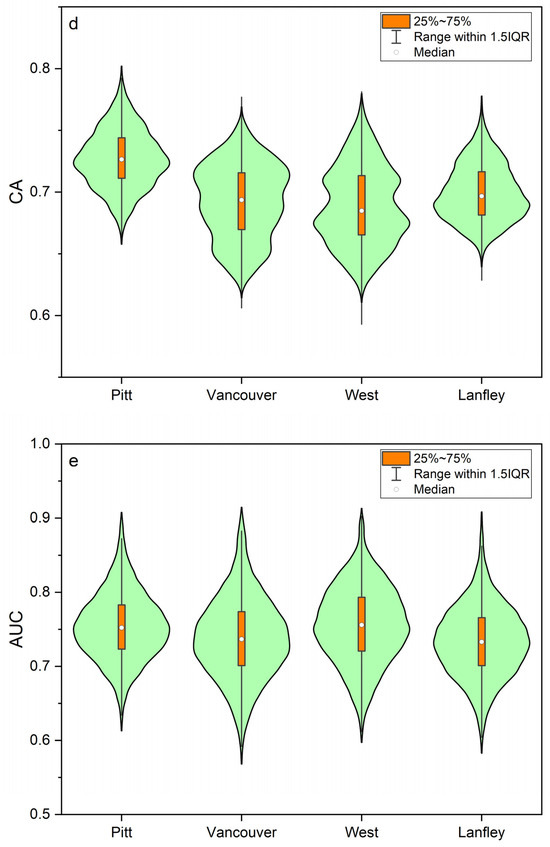 Figure 5e shows the violin plot representing the AUC metric across four stations. Similar to other metrics, the median AUC values remain constant, ranging from 0.64 to 0.66. Interestingly, West Vancouver station displays the highest median, while Vancouver records the lowest. Most data points cluster around the median and the Q1, indicating a consistent pattern across stations. However, as we move from Pitt to Langley, we notice a gradual decrease in the Q3, maximum, and minimum values, which are 1.5 times the IQR. An exception is observed in West Vancouver station, where the maximum value of Q3 occurs. The Q1 remains relatively constant, ranging from 0.7 to 0.72, with Pitt and West Vancouver showing the highest values and Vancouver and Langley displaying the lowest. The differences between Q1 and Q3 remain relatively constant across all stations. The Q4 and Q0 values follow a consistent pattern across all stations. These findings provide insights into the distribution of AUC metrics across stations, indicating variations in performance and variability. Understanding these patterns can inform strategies to enhance model performance and predictive capabilities across different spatial contexts.