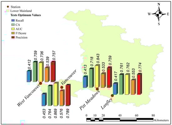 Figure 6 represents the best test values from all five evaluation metrics for four Lower Mainland Basin, British Columbia stations. The values indicated on the map for the best test values of each station are shown in Table 4: